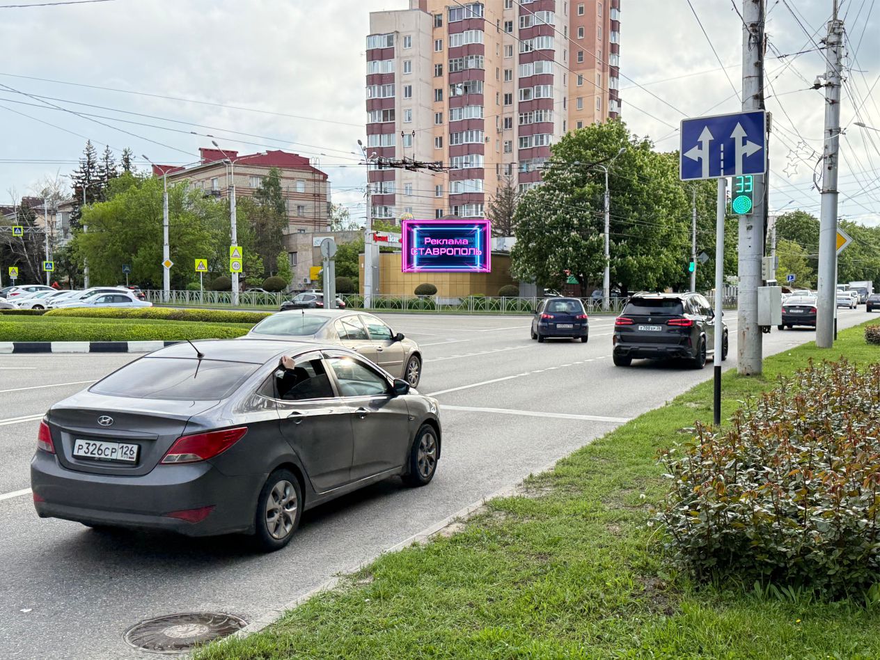 Видеоэкран расположен на пересечении двух центральных улиц: Ленина и Доваторцев. Данный перекрёсток связывает деловой центр города с Юго-Западным и Северо-Западным районами, что, в свою очередь, обеспечивает внушительный автомобильный и пешеходный трафик.